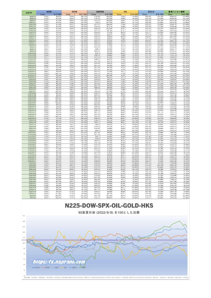・P9:日経平均/ダウ/S&P500/OIL/Goldの騰落対比グラフ